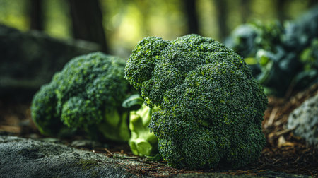 Fresh broccoli florets on rock surface: a vibrant display of nature's bounty