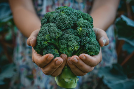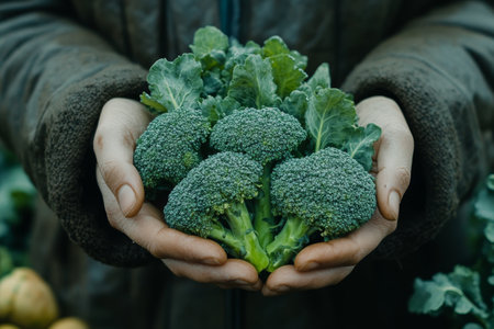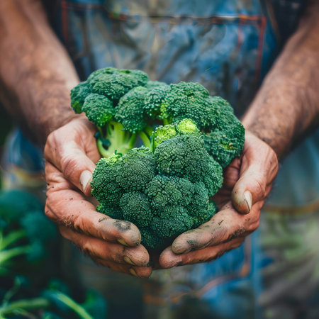 Gardener's hands holding broccoli, organic product from farm
