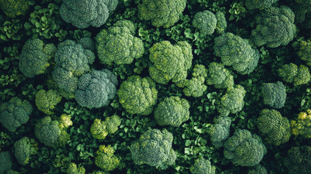 A high-angle view of a large broccoli pile, the dense arrangement of fresh green florets forming a vibrant, healthy vegetable background
