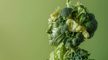 Creative portrait of a woman with a head made of green vegetables, emphasizing health and nature. Concept of eco-friendliness and sustainability in lifestyle.