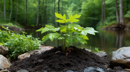 A young, healthy plant with bright green leaves emerges from a mound of dark, fertile soil, representing a fresh start and natural vitality.