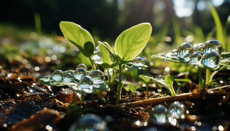 Close-up view of a forest floor with vibrant green moss, delicate new plant shoots, and ferns glistening with dew drops, bathed in soft, filtered sunlight.