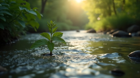 A resilient sprout emerges from a rock in a flowing stream, bathed in sunlight, symbolizing growth, nature's resilience, and the beauty of new beginnings in a tranquil environment.