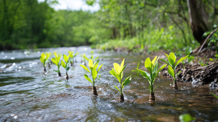 Close up stream of fresh water with young green plants. Spring nature concept. Generative AI