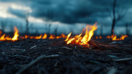 Dramatic sunrise scene of a forest fire with intense flames and glowing embers consuming dry grass. captures the urgent and destructive nature of wildfires, their environmental impact and the critical need for emergency response and awareness. Generative AI