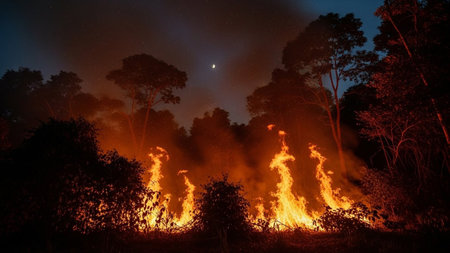 Dramatic night forest fire with towering flames and heavy smoke, emphasizing the environmental destruction and chaos.
