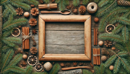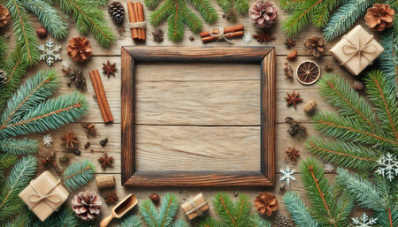 Christmas and New Year background with fir branches, pine cones, cinnamon, star anise and wooden frame.