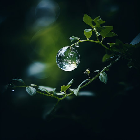 A close-up captures a water droplet hanging from a pine needle. The droplet reflects the surrounding environment. Colors include green, brown and gold. The composition highlights the detail and beauty of nature. Suitable for illustrating themes of environment, freshness, and natural patterns.