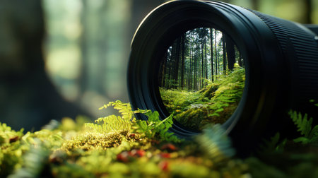 Close-up of a camera lens focusing on the vibrant greenery of a forest, highlighting the beauty of nature.