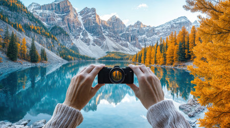 A person holds a camera up, aimed at a stunning landscape of rivers and mountains, showing a vibrant, reflective view through the lens in the cool morning air.