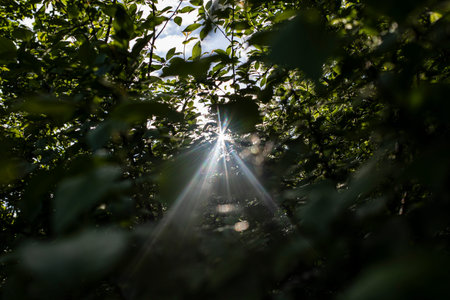 Light rays through the bushes. Light beams are visible from behind the diaphragm. Light from the setting sun.