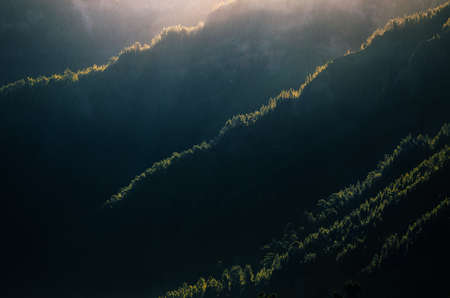 Early morning summer sunshine on the top of the pine trees in the green forest mountains in the Valais region near Grimentz in Switzerland