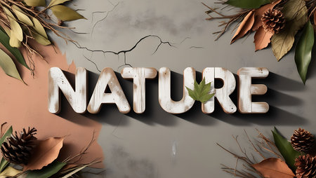 Autumn leaves and pine cones with the word NATURE. 3D rendering