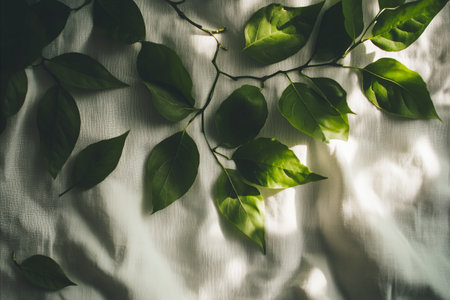 Close-up image of green leaves gently resting on a soft, white cloth. The leaves are in sharp focus, while the cloth has a subtle texture and folds. Natural light casts gentle shadows, creating a serene and peaceful atmosphere.