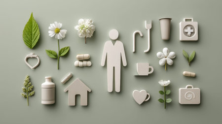 A unique composition of health and wellness items including flowers, a human figure, and medical essentials, showcasing a harmonious blend of nature and care.