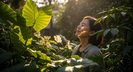 A woman stands amongst lush green tropical plants, closing her eyes and tilting her face to enjoy the warm sunlight filtering through the leaves. The scene evokes a deep sense of peace, mindfulness, and connection with nature.