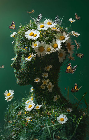 A profile view of a woman adorned with lush green foliage and white flowers as a unique hairstyle, conveying nature and beauty