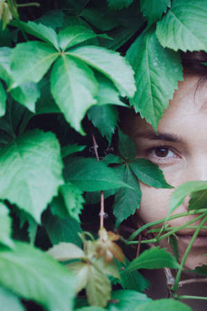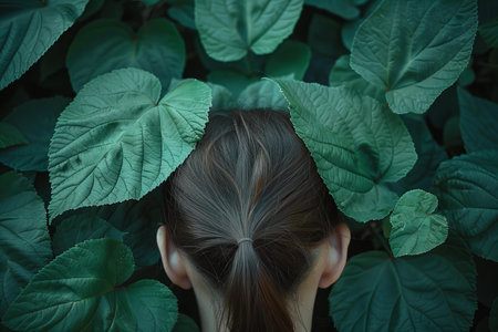 A man gently touches leaves, embracing a mindful moment in nature. The close-up captures the serene connection between human and environment, highlighting tranquility and awareness.