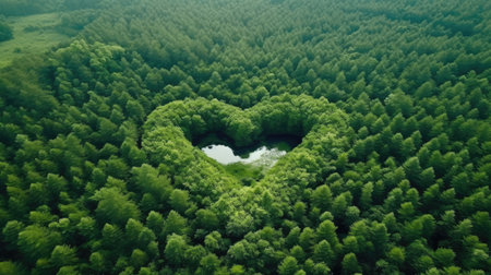 An aerial perspective captures a heart-shaped clearing carved into a dense green forest. A figure walks along a path within the heart, framed by vibrant treetops. The composition emphasizes contrast between natural forms and geometric shapes, ideal for concepts like nature and love, suitable for various commercial projects.