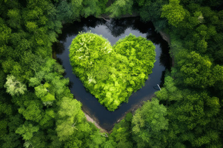An overhead shot reveals a heart-shaped clearing carved into a lush, green forest. The scene presents a textured surface, possibly earth or rock, with variations of green foliage. The composition and lighting suggest a daytime setting, suitable for illustrating natural beauty or environmental themes. Ideal for various commercial applications.