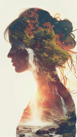 Double Exposure of Woman's Face with Ethereal Forest Elements. Blending Nature and Human Emotions