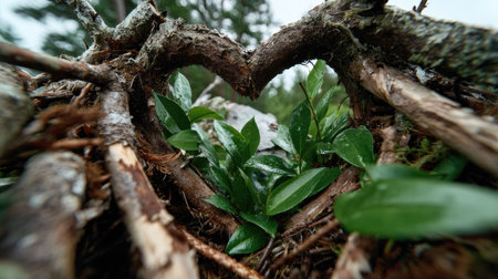 A captivating heart shape created by intertwined roots and vibrant green leaves, showcasing the beauty of nature and its ability to inspire love and connection.