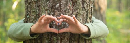 Heart hand on tree with moss, loving the nature. Hand touching a tree trunk in the forest. High quality photo