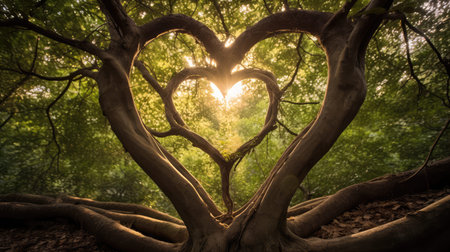 A heart-shaped cluster of vibrant green leaves rests on a sturdy branch, surrounded by rich foliage, symbolizing love and nature's beauty in harmony.