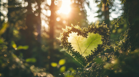 A captivating heart shape filled with lush greenery symbolizes a deep love for nature against a tranquil forest backdrop with soft diffused light.