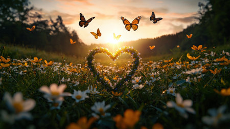 A field of wildflowers forming a natural heart shape in the center, with butterflies hovering above