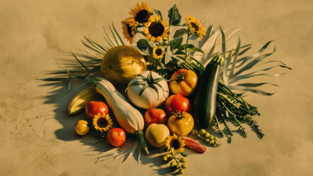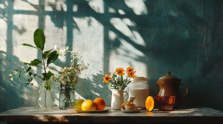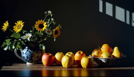 Still life arrangement of vibrant flowers and fresh fruits, illuminated by soft sunlight, creating a warm and inviting natural composition.