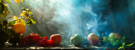 A mystical arrangement of fruits, including apples, oranges, and grapes, with ethereal smoke and beams of sunlight filtering through. The image captures a surreal, magical atmosphere, perfect for fantasy and nature-inspired themes.