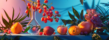 A visually striking arrangement of fruits, including grapes, oranges, and apples, set against a backdrop of modern lighting. The artistic composition and colorful elements create a contemporary and elegant scene.