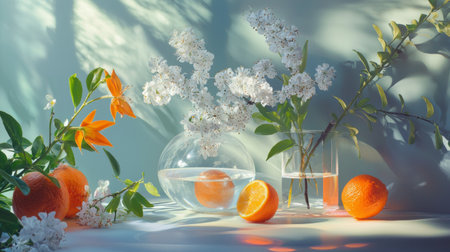 A beautiful arrangement of flowers and oranges displayed with soft shadows and natural light, featuring delicate white blossoms and bright oranges, creating a serene and elegant composition.