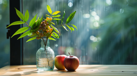 A serene still life scene features a vase with delicate branches, accompanied by a single apple, positioned near a window. The composition showcases a muted color palette with warm, neutral tones. The soft lighting suggests an indoor environment, ideal for various editorial and commercial applications.