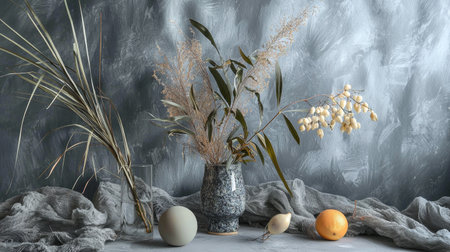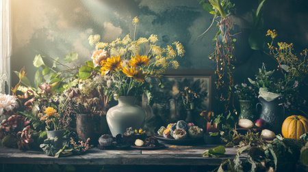 A peaceful scene featuring botanical decor, including dried flowers and natural elements, bathed in gentle sunlight. The composition exudes a sense of tranquility and connection to nature.