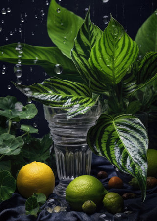 A dark, moody still life featuring tropical fruits, green foliage, and vintage glass bottles arranged against a textured background. The atmospheric lighting highlights the deep colors and rustic appeal.