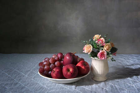 Still life with a bouquet of beautiful roses and ripe fruits.