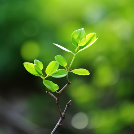 A solitary, vibrant green leaf takes center stage, bathed in the soft light of a refreshing forest setting Surrounded by delicate, budding foliage, it exudes a sense of tranquility and the promise of new life The close-up captures the intricate details of nature's artistry, showcasing the beauty and serenity of natural growth AI Generative