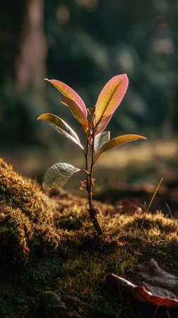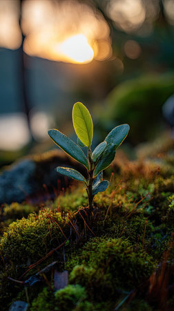 Photo of a young Feijoa growing on moss at sunrise, symbolizing hope and new beginnings.