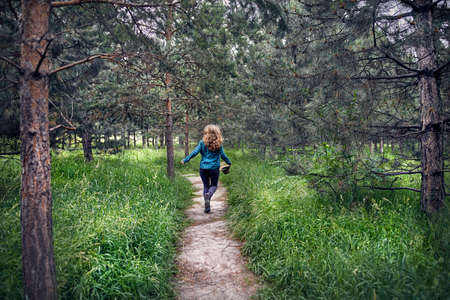 Young woman in green checked shirt with long hair running on the path in the pine forest with hat in her hand