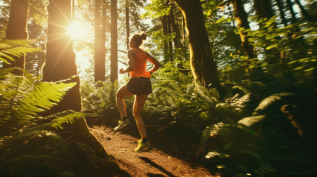 A person jogs along a winding forest trail bathed in golden sunlight. The lush greenery surrounds them as they embrace the morning tranquility and freshness of nature.