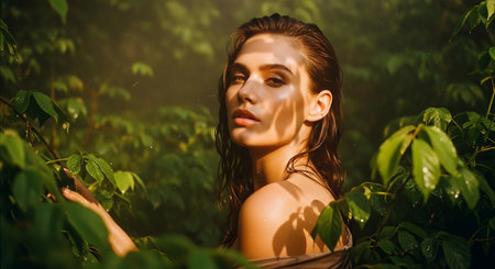A young woman with striking blue eyes and soft lips is partially obscured by lush green foliage, bathed in warm, natural sunlight. The image evokes a sense of serene beauty and connection with nature.