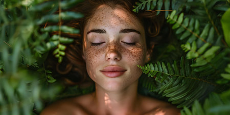 A close up of a mysterious woman partially concealed by a vibrant green fern leaf, set against a lush foliage backdrop
