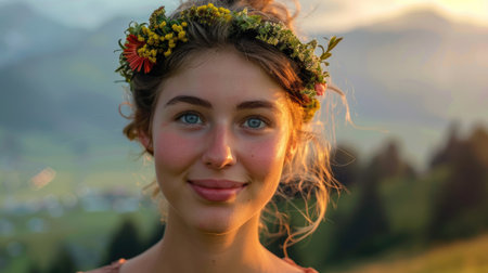 A woman wearing a flower crown on her head is smiling in a field of grass, showcasing a happy and fun headpiece at an event. The flower is a fashion accessory that adds to her joyful expression AIG50