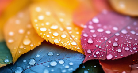 Vibrant leaves in autumn shades with droplets of water create a stunning natural display. Perfect for seasonal themes and nature-inspired projects.