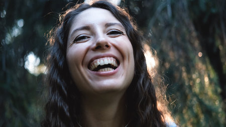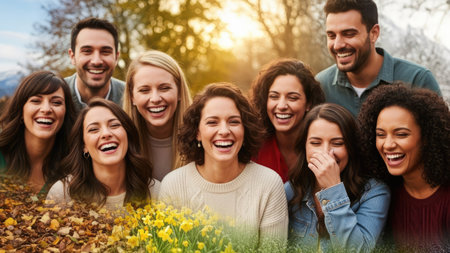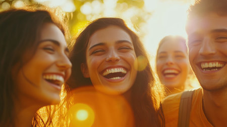 A group of friends with broad smiles and joyful laughter shares a happy moment in a sunlit park, surrounded by warm colors and a soft bokeh background.