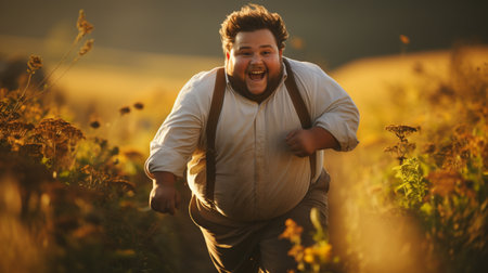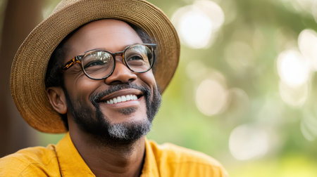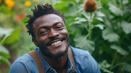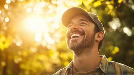 A joyful man enjoys the moment while laughing under warm sunlight in a vibrant garden filled with lush greenery, capturing a carefree spirit.