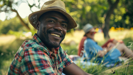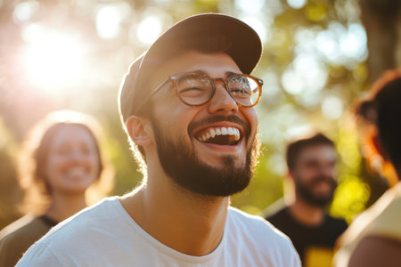 Adult man laughs heartily in bright sun with friends nearby, radiating social joy, relaxation, and friendship.