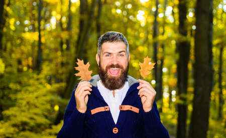 Autumn man in autumn park. Warm sunny weather. Smiling guy with yellow leaves. Male autumn fashion.